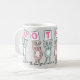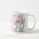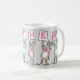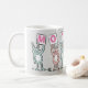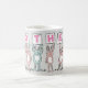 Fun Gift Mug for Mother. Fun White mug with illustration of Rabbits in pink and blue. The rabbits are holding up cards to spell out the word mother. Cute baby rabbits on a coffee mug. Gift for Mum.