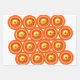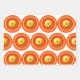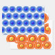 Circles and orbs are tiled in three different patterns. Blue orbs are centred over a light blue background with a central red dot. The remaining two patterns show 5 concentric circles: Central red orb is smallest, the next is a solid yellow 3d circle, next is a larger translucent looking red ball, then a ring of yellow and an outer ring of red. One pattern is the same tiling as the blue, the other pattern has the combined image offset in rows.