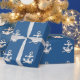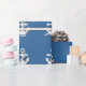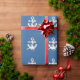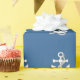 Graphic image of ship's anchor with rope line in white on deep blue background.