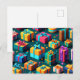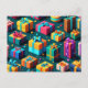 A vibrant and festive pattern featuring a variety of colourful gift boxes tied with colourful ribbons. The boxes are arranged in a playful and chaotic manner, creating a visually stimulating composition. The background is a dark teal colour, which contrasts beautifully with the bright colours of the gifts. The overall effect is cheerful and celebratory.