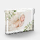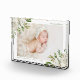 Personalised photo block keepsake with your newborn baby photo, name and birth stats or other custom text. Elegant feminine design has a painted watercolor floral border with white flowers and green and gold foliage. Use the design tools to edit the text fonts and colours or add more photos to create a one of a kind keepsake or gift.