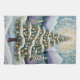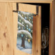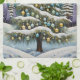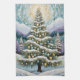 This majestic artwork portrays a beautifully decorated Christmas tree set against a serene, snow-covered mountain landscape. The tree is laden with snow and adorned with glowing golden and pastel blue ornaments. The background features stylized, snow-capped mountains and a dense forest, all rendered in a harmonious palette of cool blues, purples, and greens. A radiant sun or starburst crowns the scene in a brilliant, mosaic-like pattern of gold and white, giving the piece a rich, decorative, and spiritual quality.