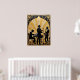 This ornate painting showcases a jazz trio silhouetted in deep black against a lavishly textured gold backdrop. A central female figure plays a trumpet, positioned between 3 male musicians, one with a trumpet and the other with a saxophone. A suggestion of a drum kit is visible behind them. The gold background is rich with swirling, embossed patterns and a prominent, stylised moon, creating a sophisticated and vintage jazz aesthetic reminiscent of the Art Nouveau or early Art Deco eras.
