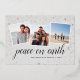 Elegant and festive holiday photo card features three square photos in a collage layout, with a border of shining rose gold foil stars and snowflakes on a pale grey background. "Peace on Earth" or your custom greeting appears along the bottom in white calligraphy script lettering, with your names or family name and the year beneath.