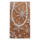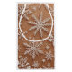 This delicate composition celebrates the intricate beauty of nature through a series of highly detailed snowflakes set against a warm, sandy ocher background. Each snowflake is rendered with fine, lace-like precision in a crisp white, creating a striking contrast that emphasizes their unique hexagonal symmetry. The background features a subtle, speckled texture reminiscent of falling frost or a light dusting of snow, while the overall warm tone lends a sophisticated, vintage holiday esthetic to the piece. The arrangement is organic yet balanced, capturing a frozen moment of winter elegance.