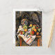 A fine art postcard with the still life painting by the French artist Paul Cezanne (1839-1906) titled, Ginger Jar and Fruit (c. 1895). A large stoneware jar on a table arranged with scattered fruit including, pears and apples.