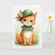 This design shows an anthropomorphic ginger kitten centered in the scene, looking straight ahead with luminous emerald-green eyes that feel like they’re holding a tender gaze for someone special 💚. It wears a forest-green bowler hat decorated with small red and peach flowers tucked among green leaves, echoing the kitten’s eye color. A matching ruffled collar circles its neck, giving it a dressed-up look that reads like a friendly date or a sweet meeting in the park. The fur is orange and white with soft striping, and the tiny pink nose and faint smile add a gentle, affectionate expression. The background is a light green wash that suggests a quiet meadow, with a few tiny white blossoms and thin blades of grass scattered around. St. Patrick’s Day text sits near the top in green lettering, with a smaller line below in a softer green, and a little ☘️ accent nearby. Light green tones spread outward behind the kitten, with delicate white flowers dotting the lower area like confetti across the grass.