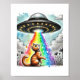 A cute ginger kitty welcomes a UFO beaming down watercolor rainbow beams in a wildflower meadow fantasy scifi art AI generated art
