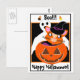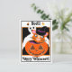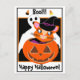 Ginger's an orange cartoon cat in an adorable black & purple witch costume, complete with pointy hat & cloak. She's sitting inside a jack o'lantern. A white ghost floats behind her. Trick or Treat! The background can be any colour.