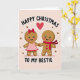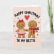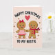 Above them, there's a festive message saying "HAPPY CHRISTMAS," and below is another sweet message saying "TO MY BESTIE." A bright red heart floats gracefully between the words, representing deep love. The background is a soft pink color with twinkling golden-brown stars and white outlines, giving a magical touch to the scene. The details on the gingerbread's arms and legs made of white icing create an interesting contrast with their warm brown bodies.
