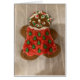 Photograph of a decorated gingerbread cookie, red dress with green Christmas trees, fun decorated face for the holidays! Inside card reads,