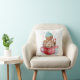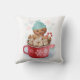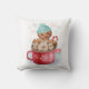 Whimsical dessert theme Christmas pillow features a cute watercolor gingerbread cookie in a knit winter hat enjoying a warm bath in a mug of hot chocolate with candy cane, marshmallows and pastel snowflake accents. Artwork by KL Stock.
