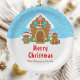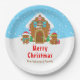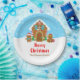 This cute and festive plate features a cute gingerbread house decorated with red and green candy. Beside it are adorable gingerbread men with gifts, dressed in Santa hats and a scarf. In the background is a bright blue winter sky with elegant falling snowflakes. The text combines decorative and sans serif fonts for a stylish and modern look. This is perfect for a Christmas gingerbread house decorating party.