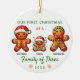 Gingerbread Family of Three First Christmas Ceramic Ornament for parents who just had their first child with mum, dad and baby gingerbread people. Our first Christmas as a family of three personalised gingerbread keepsake ornament. Celebrate the joy of a growing family with our "Our First Christmas as a Family of 3" ornament – a heartfelt keepsake for new parents to cherish their first holiday season with their little one. This beautiful ornament is thoughtfully crafted to capture the warmth and wonder of welcoming a first child, personalised with the family's names and the year for a truly one-of-a-kind piece. Made to hang proudly on the tree, it brings a touch of elegance and warmth with festive details that are sure to spark memories each holiday season.