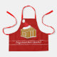 A red, Christmas, apron with a smiling cartoon gingerbread house that's wearing a Santa hat. This festive and fun apron includes the words "Gingerbread House Architect" in white letters. The words are customisable.