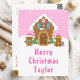 This fun and festive holiday card can be personalised with a name or title, such as daughter, granddaughter, niece, friend etc. It features a cute gingerbread house decorated with pink and green candy. Beside it are adorable gingerbread men with gifts, dressed in Santa hats and a scarf. In the background is a bright pink winter sky with elegant falling snowflakes. The text combines decorative and sans serif fonts for a stylish and modern look. This is perfect for a Christmas gingerbread house decorating party.