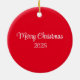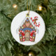 Christmas Ornament is shown in a round shape with a white background and a red colored back side with a cute holiday gingerbread house print.