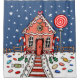 A colorful illustration of a festive gingerbread house. The outside of the house is decorated with two candy canes and has a large lollipop tree in the garden. The ground is covered in bright white icing sugar snow and strewn with sweets.