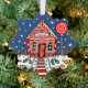 A colorful illustration of a festive gingerbread house. The outside of the house is decorated with two candy canes and has a large lollipop tree in the garden. The ground is covered in bright white icing sugar snow and strewn with sweets.