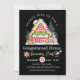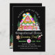 An black Gingerbread House Decorating invitation invitation with a colourful gingerbread house, snowman and gingerbread man design. This holiday cookie party invitation is available to be personalised with your information.