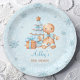 A little man is on the way! Christmas boy baby shower paper plates with an adorable gingerbread man, Christmas tree, gift and snowflakes all in baby blue and beige. Easily personalise all the text.