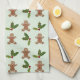 Gingerbread men and holly pattern on festive kitchen towel with green trimming.