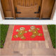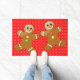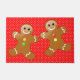 Two large cute gingerbread men with gumdrop buttons on white polka dots on red background.
