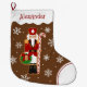 March into the holidays with this unique gingerbread nutcracker Christmas stocking! This delightful design features a gingerbread cookie soldier wearing a red nutcracker coat and hat, holding a candy cane staff and a Christmas wreath. The brown snowflake background adds a festive, timeless touch. Perfect for classic Christmas décor, nutcracker collectors, or anyone who loves gingerbread cookie designs.