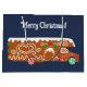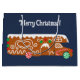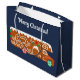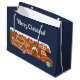 This gift bag is ready to be customised with your own message and features a festive illustration of a gingerbread RV. This cookie class C camper is decorated with white icing and red and green Christmas candy. The graphic is set against a navy blue background with your custom text above in white lettering.