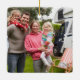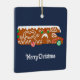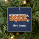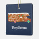 The front of this Christmas ornament features an illustration of a gingerbread camper. The festive cookie RV is decorated with white icing and red and green candy and set against a navy blue background. The "Merry Christmas" message below the graphic can be personalised with your own text. The reverse side of the ornament is ready to be customised with your own photo, perfect for sharing a vacation memory.