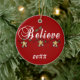 A string of gingerbread boys and text that reads "Believe" on a keepsake holiday ornament you can personalise with the current year.