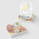 The coasters are gorgeous, a quality feel and heavy weight. They look like a precious archeological find. A rustic stone juxtaposed with a modern floral black and white print. I like the way the print goes slightly imperfect on the cut stone edges giving them a kind-of natural beauty.