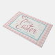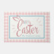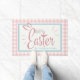 This adorable Easter doormat features a pink and white gingham plaid background with a baby blue and pink "Happy Easter" decorative script adorned with bunny rabbit ears. Personalise by adding your family name.