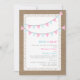 A gender reveal party invitation featuring an illustration of pink and blue gingham bunting at top. Background is burlap inspired with lace inspired design.