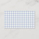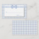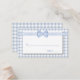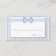 Sweet country chic wedding escort place cards, done in a light blue and white chequered gingham pattern, with a white text area. Graphics of a light blue and white gingham ribbon and bow stretch across the top. Matching wedding products available.