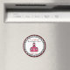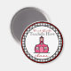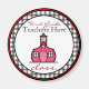 A magnet for teachers featuring the logo of The Pink Schoolhouse inside a circle shaped black gingham frame with red trim. Black and red text reads "First Grade Teachers have class."