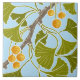 Arts & Crafts "Ginkgo Dance" Design Ceramic Tile. This block print style design features green Ginkgo leaves waving or 'dancing' in a summer breeze against a blue sky background with orange and yellow marbled fruits suspended by slender green hanging branches. The "Ginkgo Dance" Ceramic Tile is sure to bring a beautiful sense of nature to your interior decor and lift the spirit!