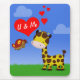 A cute and colourful illustration with a giraffe and a butterfly with red hearts.