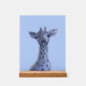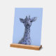 This image of a cute tender giraffe baby boy with big eyes is featured on a soft baby blue background.