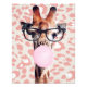 Giraffe wearing glasses and blowing a pink bubble gum with animal print background.