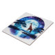 A graceful giraffe stands by a tranquil lake, illuminated by a full moon. Surrounding trees create silhouettes against a vibrant starry sky, adding a magical touch to the serene landscape.