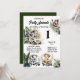 A fun and trendy 3D ai generated graphic featuring a cute and adorable baby elephant and giraffe each driving his own safari vehicle; wearing colonial floppy hats set against a white background that has custom text templates and large leaf greenery on it. A large black template for the birthday boy or girls age may be personalised; while the back is a dark forest green. These are ideal for any jungle, safari, wild animal or wildlife summer fun birthday party theme for kids. Instant downloads include both the front and back of the invitation.