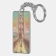 AI generated image of a giraffe walking in San Francisco on the Golden Gate Bridge in a vintage style. You can easily personalise this keychain with your own name.