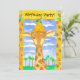 A fun invitation for a birthday party featuring a sweet giraffe in an orange party hat with a calm blue sky with clouds and a peaceful green landscape illustrated with watercolor. You can customise the text to fit your needs. I have matching postage stamps in my shop for mailing the invitations!