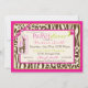 Cute giraffe and a wild pacifier with zebra, giraffe, leopard, and cheetah patchwork prints with 3D-look lace trim ribbons baby shower invitation. Colours are pinks, greens, and browns.