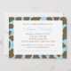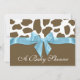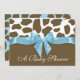 Fun brown giraffe spots and a big blue bow, little boy baby shower invitation with customisable text. All parts of this invitation are printed. There is no real ribbon attached.