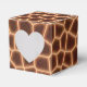 These favour boxes display a giraffe print. This is a great item for giraffe themed, animal themed, safari themed, zoo themed, or jungle themed baby showers or birthday parties.