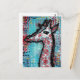 A colourful patterned giraffe portrait in red, turquoise, yellow and navy blue.