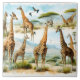 This artwork showcases a vibrant watercolor design with multiple giraffes in a serene savanna setting.