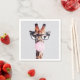 Giraffe wearing glasses blowing a pink bubble gum napkin